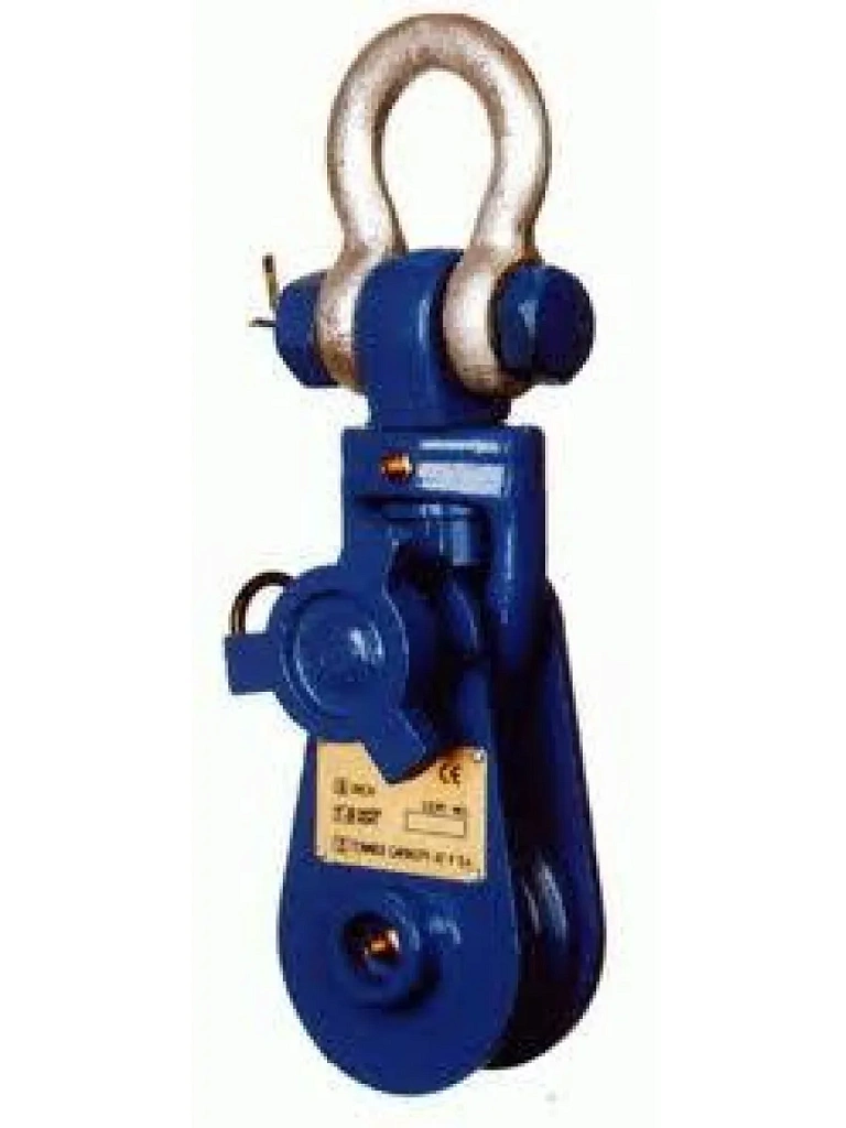 Блок с проушиной крепится через соединительный элемент, при работе он располагается перпендикулярно середине продольной оси барабана лебедки.