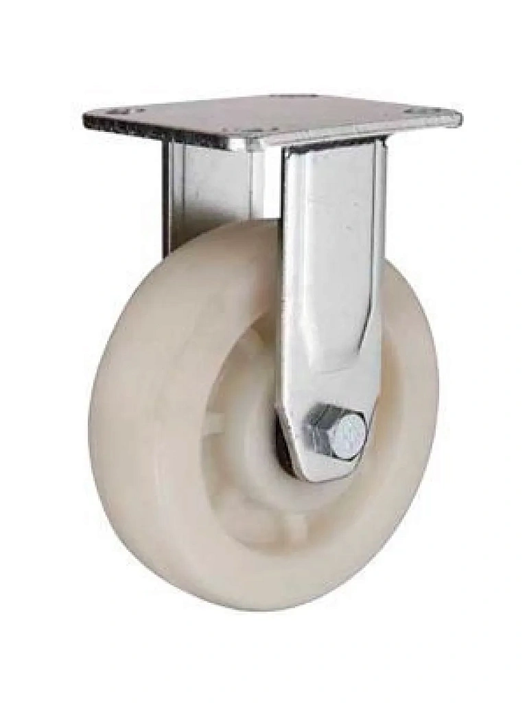 Большегрузные нейлоновые колеса фиксированные с площадочным креплением - подвижные опоры, которые состоят из металлического неповоротного крепления и сплошного полиамидного обода с подшипником. Отличительные качества данных устройств – бесшумность, способность переносить высокие нагрузки, устойчивость к стиранию и деформации при длительном использовании, небольшая масса в сравнении с аналогами. Их обод и контактный слой представляют собой цельную конструкцию. Характер движения – прямолинейный. Рабочая среда включает как помещения, так и уличные условия при любых естественных температурных колебаниях.