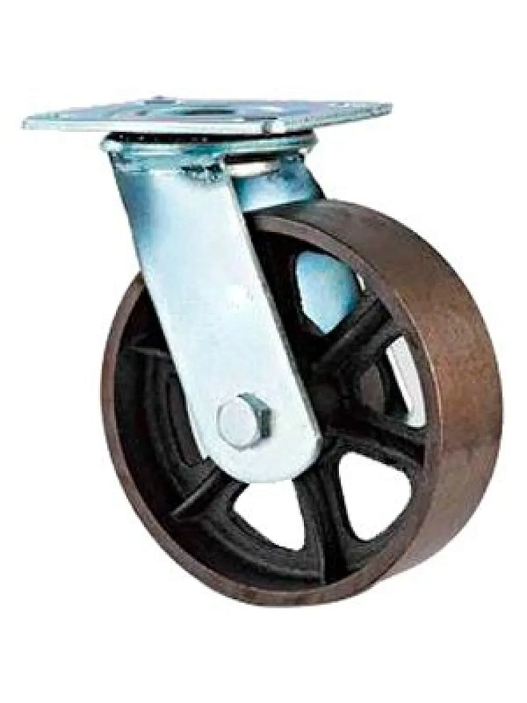 Большегрузные чугунные колеса с креплением площадочного типа и темным ободом поворотные – механизмы, которыми комплектуют различные тележки и иную передвижную технику в производственной, складской, логистической и других сферах. Основная особенность колесных опор этого вида – возможность работы с высокими нагрузками при сравнительно малом диаметре. В комплект входит подшипник. Металлическая опора с поворотным механизмом обеспечивает высокую маневренность и удобство ориентации на рабочей поверхности.