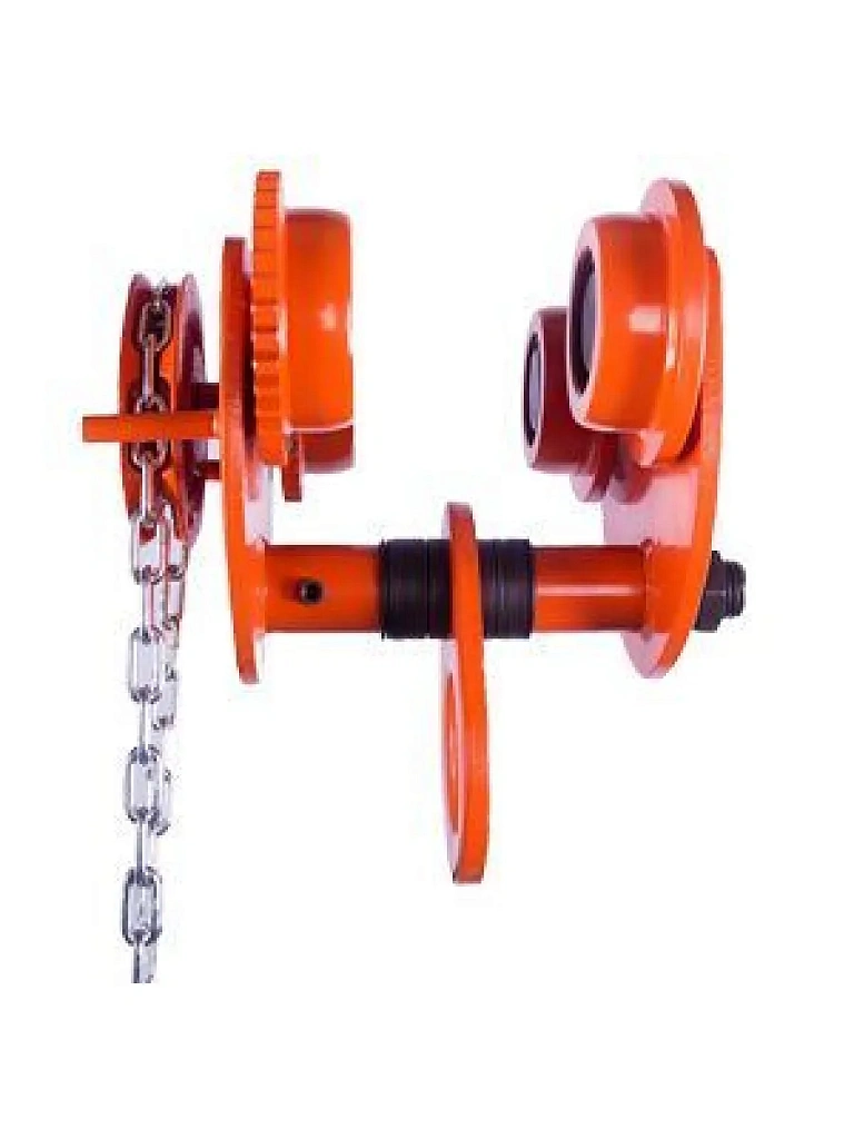 Такая тележка состоит из двух металлических щек, скрепленных между собой болтами, роликов, предназначенных для фиксации устройства на монорельсе и обеспечивающих плавный ход, цепи и механизма, управляющего движением (сочетание редуктора и приводного колеса).
