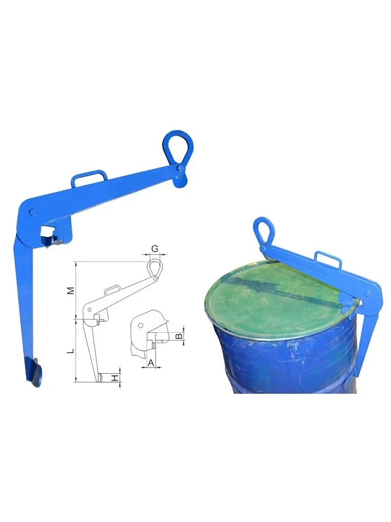 Захват для бочек имеет простую и надежную конструкцию типа "клюв попугая", имеет небольшой вес и удобен в работе. Отличительной особенностью захвата является его бережное отношение к элементам конструкции бочки. Грузоподъемность одного захвата составляет 0,2т или 0,6т.