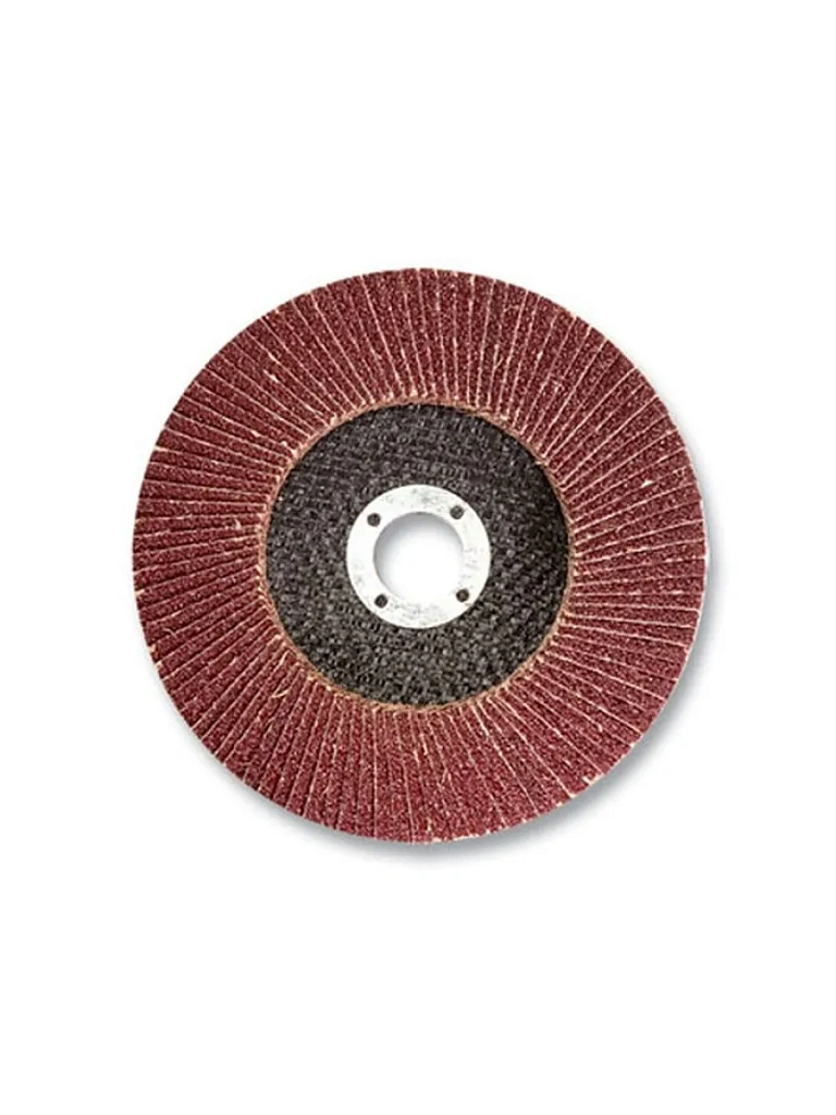 Круг лепестковый торцевой изготовлен из прямоугольных элементов шлифовальной шкурки на тканевой основе, которые расположены в виде веера на подложке из стекловолокна.