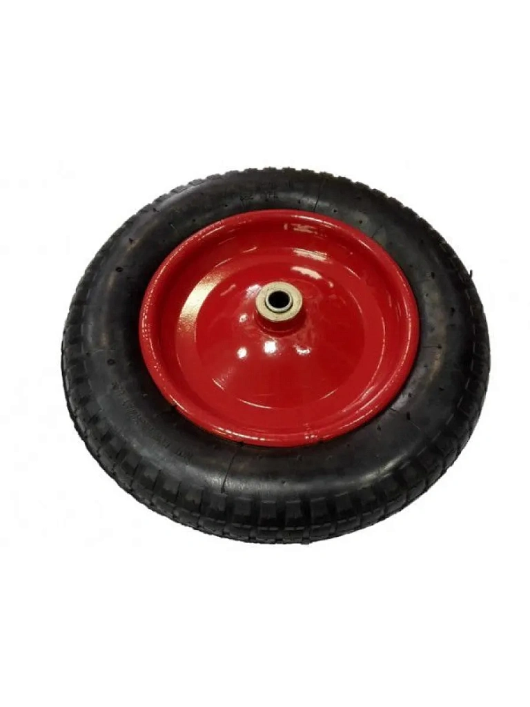Основное отличие пневматических колес для тачек от литых (полиуретановых) заключается в наличии резиновой камеры внутри покрышки. Камера с покрышкой монтируются на стальной обод и через ниппель накачивается воздухом до нужного давления.