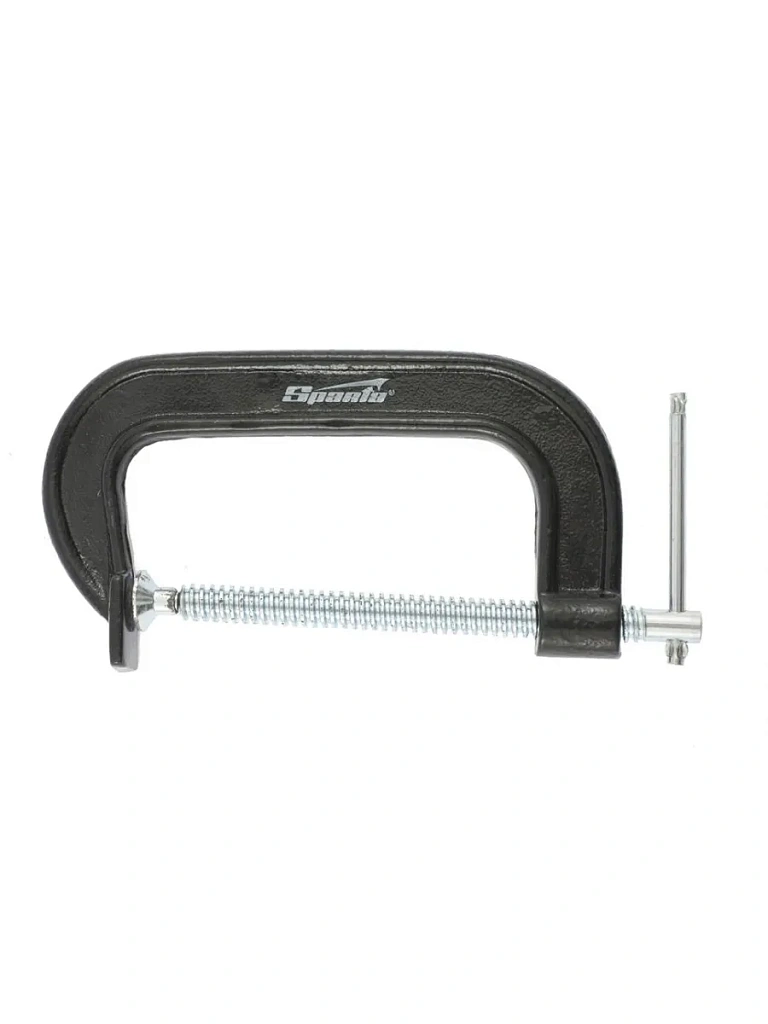 Рама струбцины покрыта цветным лаком. Винт струбцины со специальным зажимом и крупной червячной резьбой позволяет надежно фиксировать предметы.