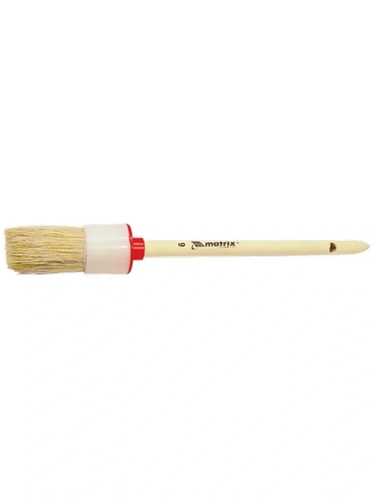 Ворс кисти из натуральной светлой щетины, расщепленной на концах. Диаметр кисти от 20 до 65 мм. Щетина кисти надежно закреплена пластмассовым бандажом. Ручка изготовлена из дерева. Кисть предназначена для работ с масляными красками и лаками, устойчива к агрессивным составам. Применяется для окраски и грунтовки небольших по площади поверхностей.