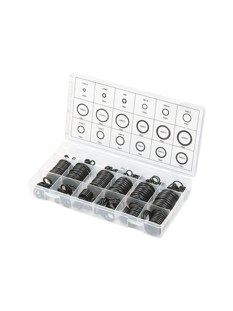 Набор резиновых уплотнительных прокладок поставляется в компактном кейсе из пластика, который обладает отсеками под каждый размер и нумерацией размеров на крышке. Прокладки выполнены из резины и служат для герметизации различных соединений, например, для предотвращения утечки. В комплекте представлены уплотнительные прокладки самых распространенных размеров.