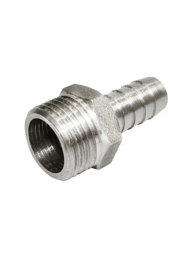 Штуцер под шланг с наружной резьбой предназначен для подключения поливочного шланга к водозапорной арматуре или непосредственно к трубопроводу. Изделие можно применять также в других системах с неагрессивной к используемым материалам рабочей средой (горячая вода, незамерзающий теплоноситель, сжатый воздух и т.д.). Штуцер изготавливается из горячепрессованной латуни. Дополнительный запас прочности обеспечивается за счёт покрытия никелем, предотвращающим появление коррозии, а также защищающим от механического износа и вредного воздействия агрессивных жидкостей и воздушно-газовых сред. Присоединительный патрубок штуцера имеет наружную резьбу с насечками для лучшего удержания герметика. Сам штуцер для шланга имеет конфигурацию, эффективную для его фиксации. Присоединение шланга необходимо производить с помощью стальных винтовых хомутов