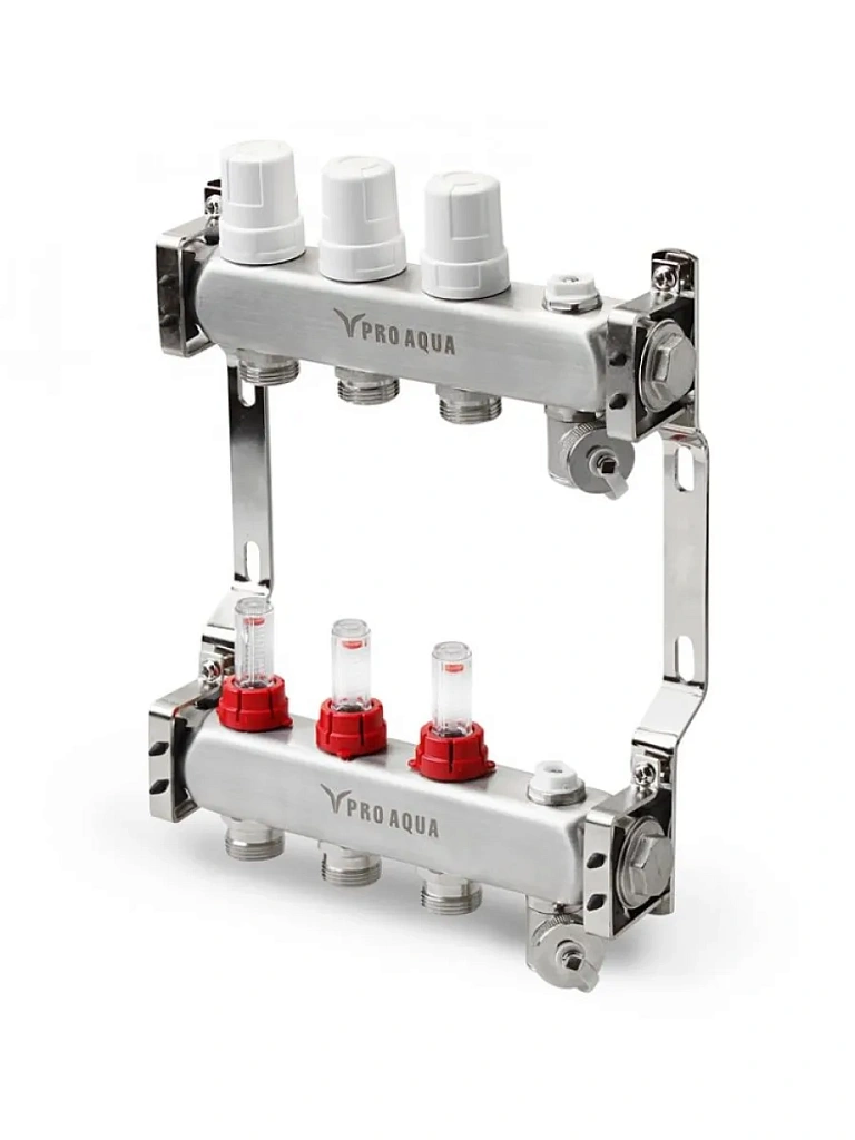 Новые коллекторные блоки Pro Aqua – это эффективное решение для организации системы отопления и теплого пола. Блоки произведены из нержавеющей стали марки AISI 304, которая является одним из самых экологичных материалов. Толщина стенки коллекторного блока Pro Aqua увеличена и составляет 1,6 мм, стандарт 1,5 мм. Коллекторные блоки имеют увеличенное проходное сечение 40x40.7 мм (16.28 см2) и обладают повышенной пропускной способностью.