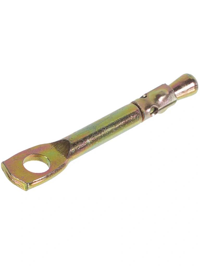 Крепежная деталь имеет уникальную конструкцию, благодаря которой после монтажа получают прочное несъемное крепление. Потолочный анкер представляет собой гладкий стержень с распорным узлом на одном конце и ушком с отверстием диаметром 6,3 мм для быстрого крепления подвесных элементов – на другом.