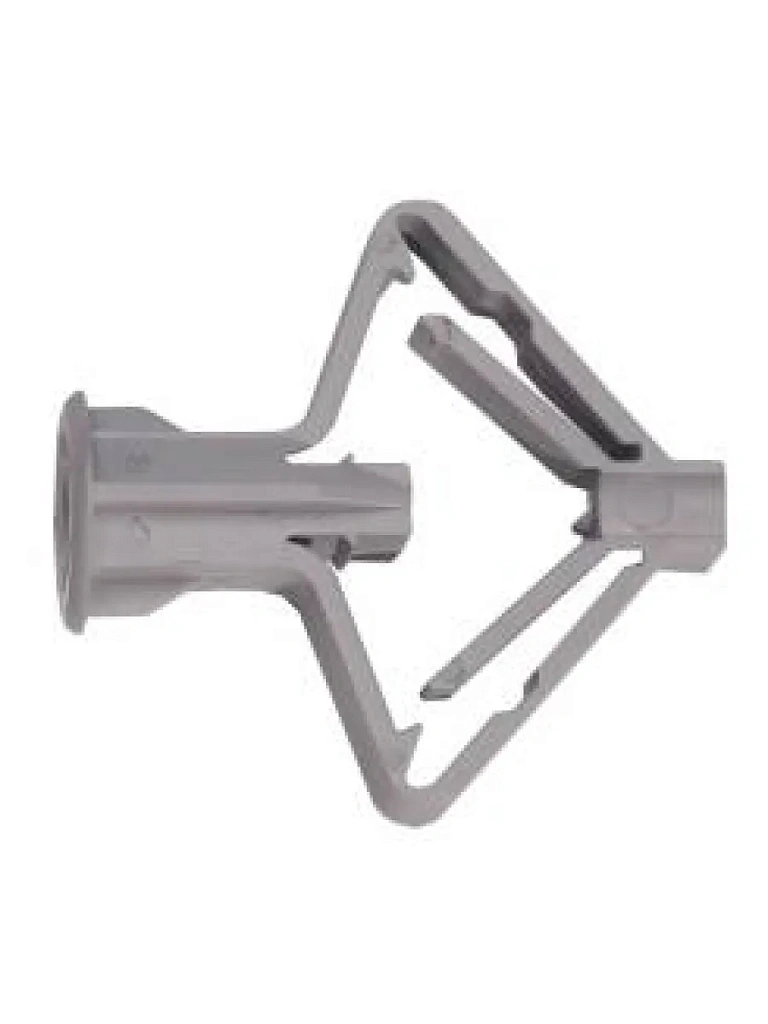 Состоит из двух частей: распорной и статичной. Распорная часть вставляется в отверстие, проделанное в гипсокартонном листе, и при вкручивании резьбового крепежа расширяется, тем самым делая соединение прочным. На дюбеле есть кайма, которая не позволяет ему провалиться в гипсокартон.