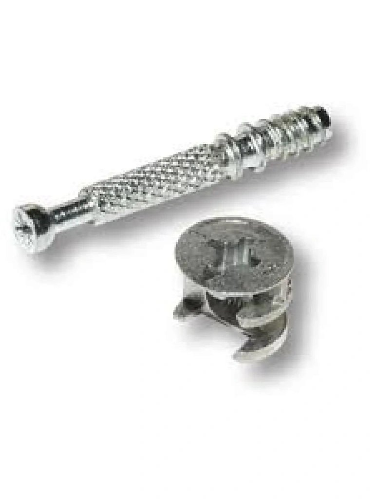 Долгое время в производстве использовался конфирмат (евровинт), но прогресс не стоит на месте и как альтернатива конфирмату была изобретена эксцентриковая стяжка. Эксцентриковая стяжка используется для соединения двух элементов ДСП. Основным преимуществом эксцентриковой стяжки является ее скрытая установка в панели ДСП. Таким образом с внешней стороны изделия не нужно устанавливать пластиковые заглушки, это создает более эстетичный вид . Эксцентриковая стяжка в основном используется для крепления боковых стенок и фасадов в выдвижных ящиках, в различных вариантах, так же достаточно широко используется в креплении верхней крышки столов.