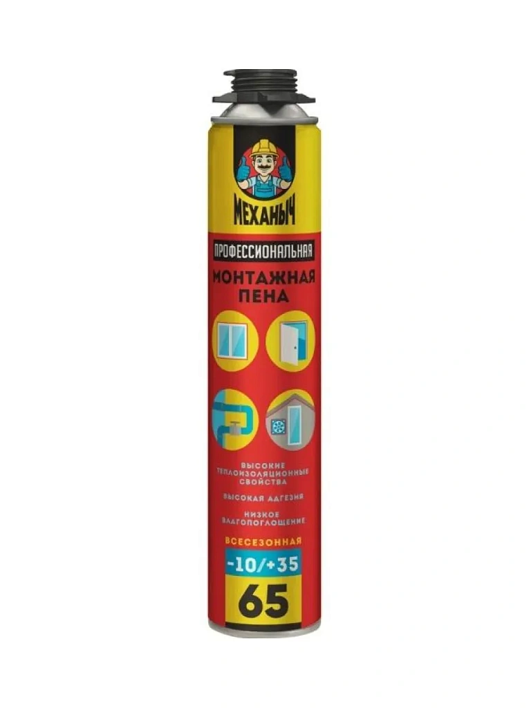 Пена монтажная МЕХАНЫЧ 65 – профессиональная универсальная однокомпонентная полиуретановая пена, предназначенная для работы в диапазоне температур от -10°С до +35°С. Наилучшие результаты достигаются при применении пены при температуре не ниже -12°С.