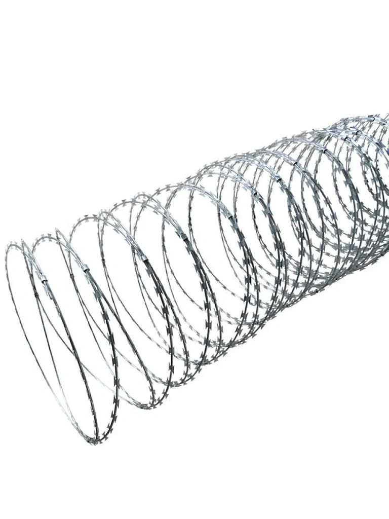 В этой ленте высечены обоюдоострые и расположенные симметрично друг к другу шипы, имеющие высокий уровень колющей и режущей способности. После скрепления витков по спирали при помощи скоб в пяти и более равноудаленных местах, ее защитные свойства становятся еще сильнее.