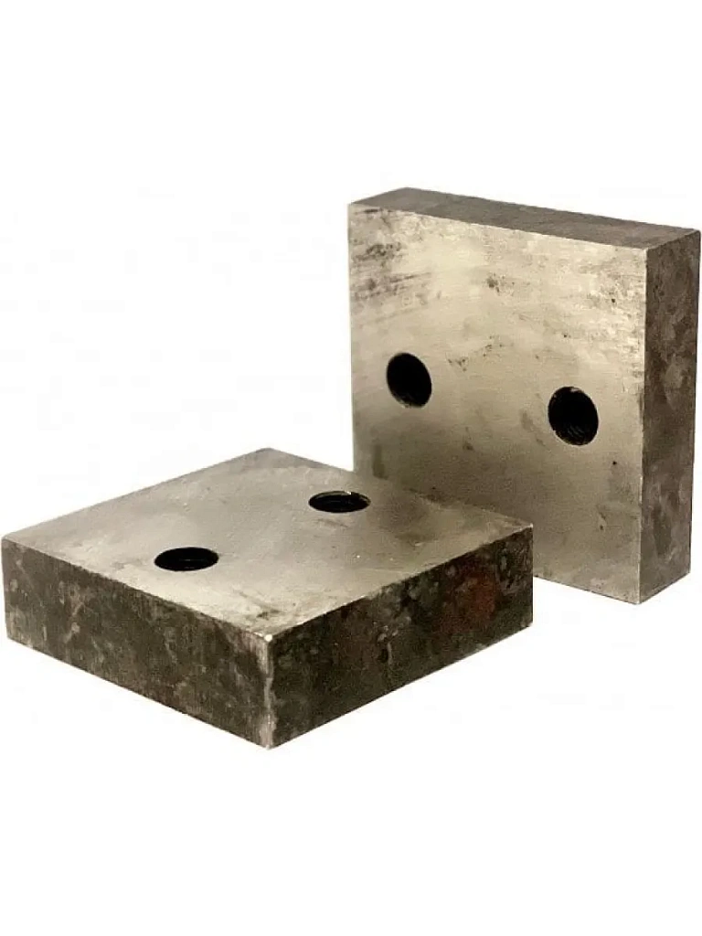 Комплект ножей для резчика арматуры. Применяется для обработки стальных прутьев арматуры с винтовой нарезкой и без неё. В комплекте два ножа: один подвижный, другой неподвижный. Габариты подвижного ножа – 90х26х90 мм. Габариты неподвижного ножа – 90х26х90 мм. Диаметр отверстий – 17 мм.