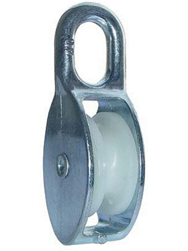Стальной оцинкованный блок с пластиковым шкивом применяется для изменения направления движения для тросов / канатов и увеличения силы в грузоподъёмном оборудовании